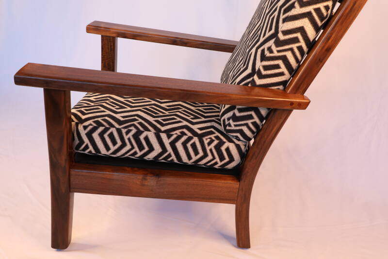 Robustly built in solid Black Walnut, this easy chair echoes the famous Morris chair in its dimensions and stance. The rear legs are laminated with eight layers of walnut and the slatted back provides a wonderfully ergonomic, slightly inclined support for a chair that accomplishes its goal of providing peaceful enjoyment. With a wide arm for a morning cup of coffee and a 4" thick seat cushion with a 2.5" sub-cushion, this is a comfortable, elegant chair meant to last for many generations,