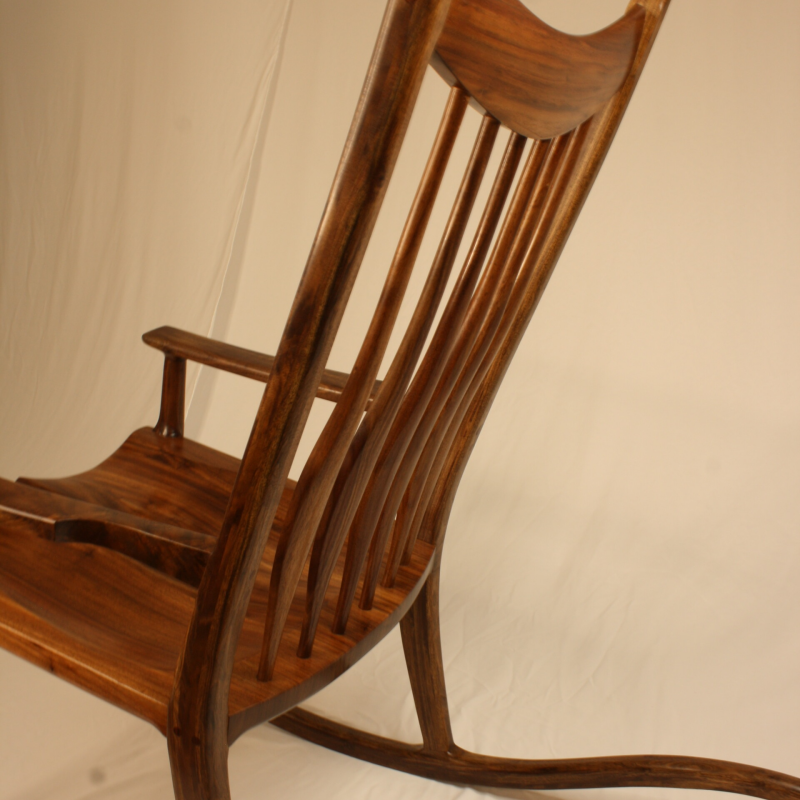 Maloof style rocking chair in highly figured Black Walnut; sourced and milled from downed trees in Shasta and Siskiyou Counties. The rocker is comfortable and accommodating to large and small bodies. This is the first rocker I have made in this style and have started another in Sapele.